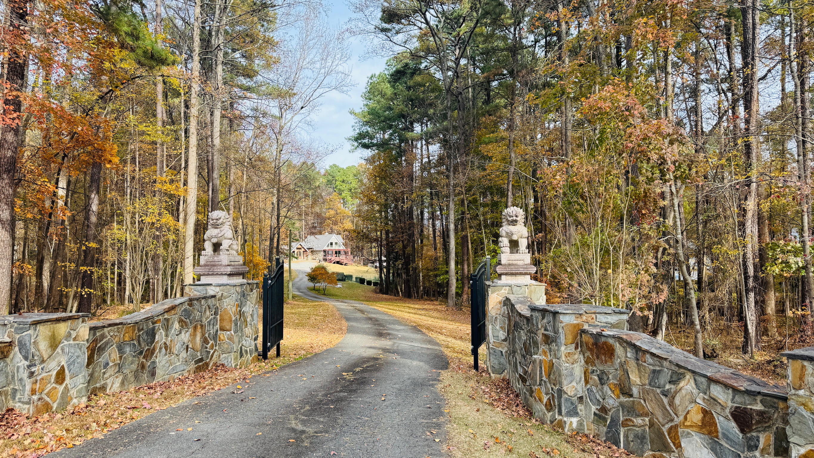 Set behind an iconic lion flagstone gate, this private 5-acre hilltop estate is ideal for family gatherings, corporate retreats, and executive stays in the heart of the Research Triangle, just 10 minutes from RDU Airport.